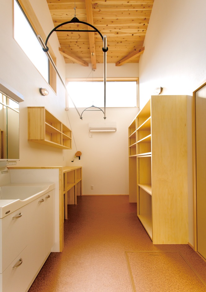 大量の洗濯物を部屋干しできる脱衣所は家事時間の短縮になる ポールから下ろして畳み そのまま造作棚に収納できる イエタテ