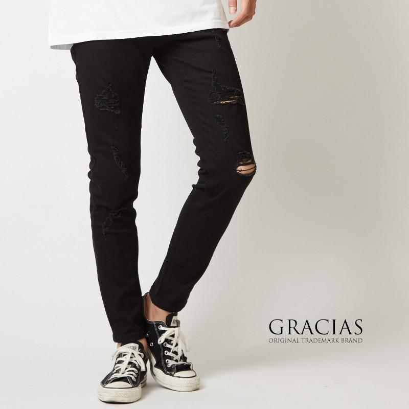 ブラック スキニー デニムパンツ メンズ 黒 ダメージ クラッシュ 加工 ストレッチ スキニー デニム スキニーパンツ ジーンズ ジーパン 40166 Graciasショッピングストア 通販 Yahoo ショッピング